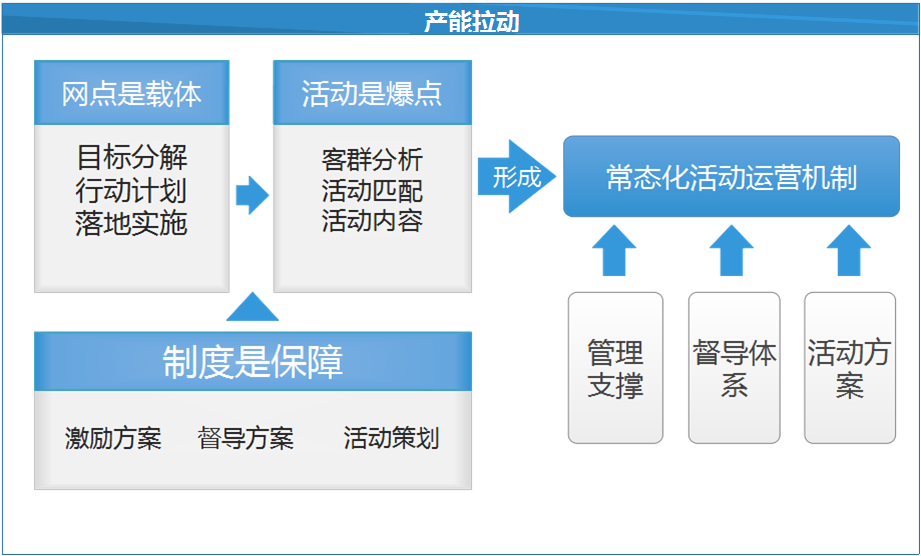 本项目以网点为载体,制度为保障,通过多样化活动进行爆点营销来拉动网点产能,同时建立常态化活动运营及督导机制,保证产能提升的持续、固化。