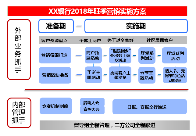 本方案建议旺季营销从外部业务抓手和内部管理抓手两个方面进行系统性的旺季营销体系设计。